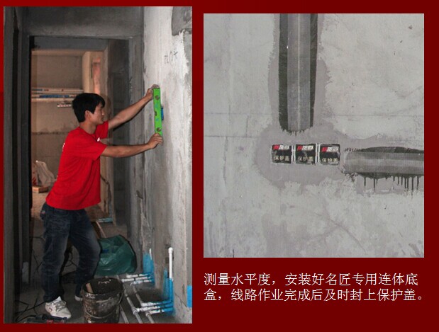 • 測量水平度,安裝好名匠專用連體底盒,線路作業完成后及時封上保護蓋
